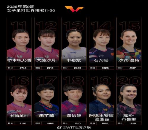 体育播报2月23日宣 今日,国际乒联公布了2026年第9周女单世界排名,前十球员里有6名国乒选手,其中孙颖莎、王曼昱、陈幸同位列前三,蒯曼第5位,王艺迪第7,陈熠第8。