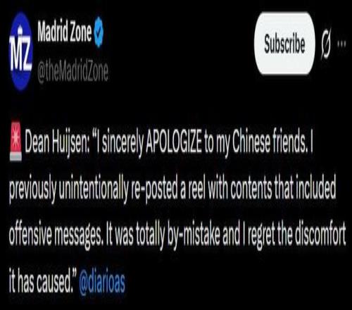 赫伊森通过皇马在中国极具影响力的社交媒体平台微博发布了道歉声明。该平台月活跃用户约5.82亿。他在声明中表示:“我为我之前的转发行为真诚地向中国朋友们道歉。我不慎转发了一条含有冒犯性内容的帖子,这绝非我的本意,我对因此造成的伤害深表歉意。”